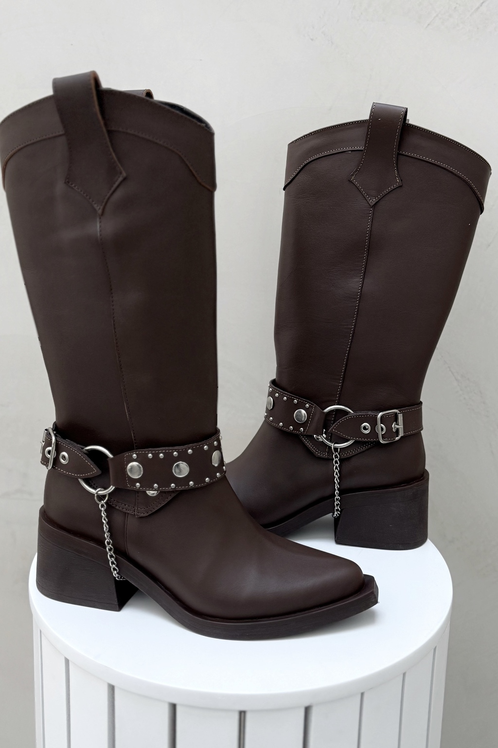 Estas botas texanas chocolate 3 en 1 son el must-have definitivo para cualquier amante del calzado con personalidad. Diseñadas con caña desmontable y estribo removible con tachas y cadena, te permiten usar un solo par de botas en tres formas distintas: